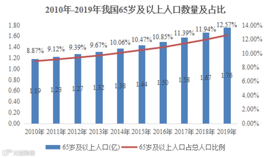 近年来,我国人口总量稳步增长,人口老龄化趋势不断加剧。根据国家统计局数据显示,自2010年至2019年,我国65岁及以上人口数量从1.19亿增加至1.76亿,整体增长48.00%;占总人口比重从8.87%增长至12.57%。未来我国老龄化人口数量将进一步增长。