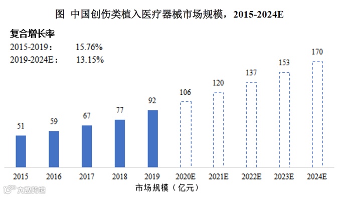 创伤类产品一直占据我国骨科植入医疗器械市场最大份额,市场技术最为成熟、开发最为充分、国产化率最高,预计未来同质化竞争将进一步加剧,产业整合趋势明显。2019年创伤市场规模达到92亿元,同比增长19.48%,自2015年至2019年年复合增长率达到15.76%。2024年国内创伤规模将达到170亿元,2019年至2024年年复合增长率达13.15%,继续保持较高速的增长。