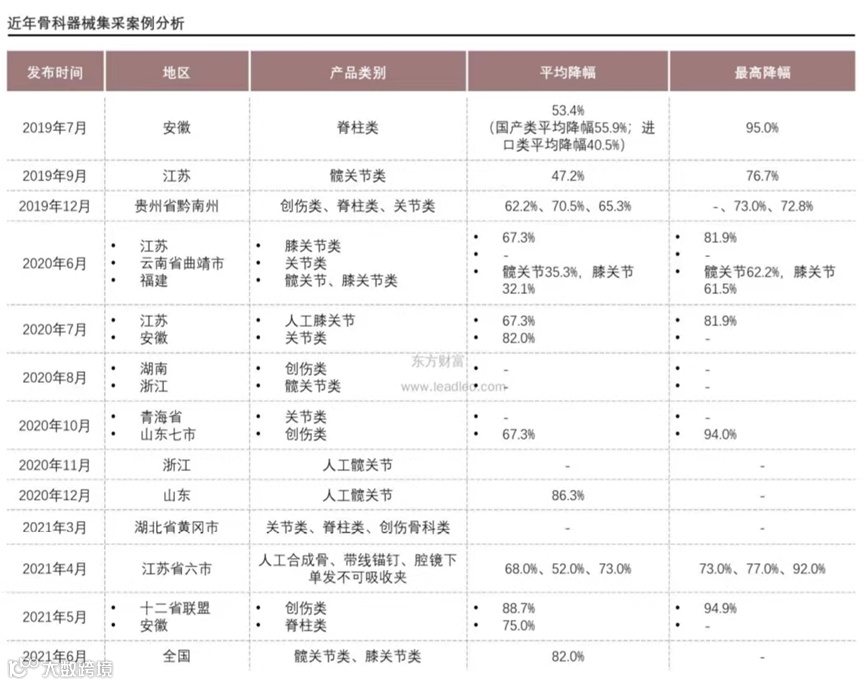 中国骨科植入器械起步较晚,但各省市近年来积极开展集采活动,所有集采活动均涉及到骨科植入器械的各个细分领域,给国内公司提供良好的竞争环境。尤以针对关节类产品的集采案例最多;每场集采活动的平均降幅最低约3成,最高可达8成,更有产品的最高降幅达到95%。