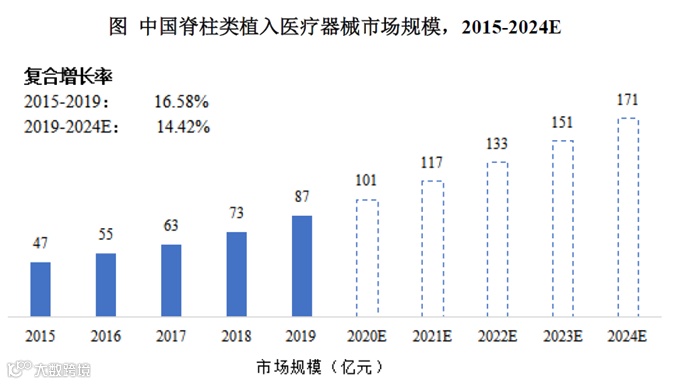 脊柱类产品增速与市场保持一致。2015至2019年,脊柱类植入器械市场的销售收入由47亿元增长至87亿元,复合增长率为16.58%,与骨科植入医疗器械整体市场的增速基本保持一致。以2019年的87亿元为基数,预计到2024年我国脊柱类植入器械市场规模在171亿元左右,未来5年的复合增长率在14.42%左右。