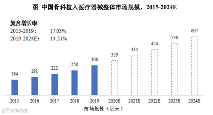 根据威高骨科招股书,以 2019 年的 308 亿元为基础,预计到 2024 年我国骨科植入医疗器械市场规模在 607 亿元左右,未来 5 年的复合增长率在 14.51%左右,我国骨科植入医疗器械市场仍将保持快速增长的趋势。