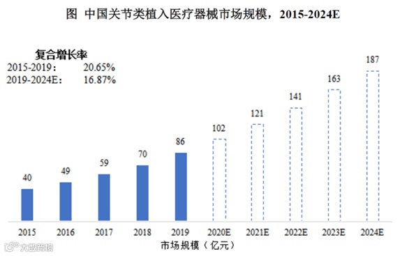 关节类植入医疗器械增速最快。2015至2019年,关节类植入器械市场的销售收入由40亿元增长至86亿元,复合增长率为20.65%。关节类相关产品的生产技术门槛高,价格贵,国内市场的开发还尚未成熟,市场份额相对较小,增速最快。以2019年86亿元为基数,预计到2024年我国关节类植入器械市场规模在187亿元左右,未来5年的复合增长率16.87%左右。