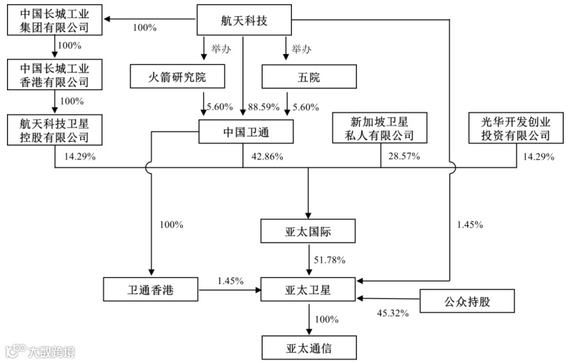 公司前身为我国六大基础电信运营企业,2001年在原卫星、通信公司等有关企业基础上合并组建了卫通集团,2009年卫通集团的基础电信业务(卫星转发器出租出售业务除外)并入中国电信,公司主体及卫星空间段运营业务变更为卫通有限,并入航天科技。2017年,卫通有限整体变更设立中国卫通,并于2019年6月在上海证券交易所上市。公司控股股东、实际控制人航天科技集团直接持股公司79.73%股份,通过下属单位火箭研究院、五院间接持有公司 10.08%股份,实际控股比例高达89.81%。中国卫通旗下有香港核心子公司为亚太通信,也主要从事卫星空间段运营相关业务。