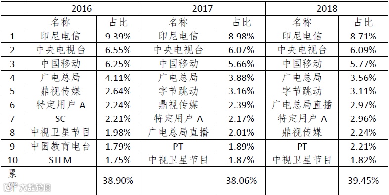 公司2016、2017、2018年前三大客户保持不变,其中印尼电信三年平均占比9%左右,是公司境外第一大客户也是公司境内外第一大客户。前十大客户中,主要为境内客户。
