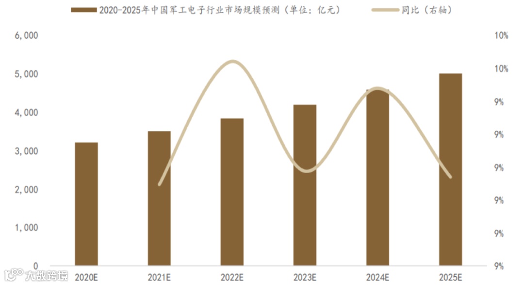 图表:中国军工电子行业市场规模、增速预测