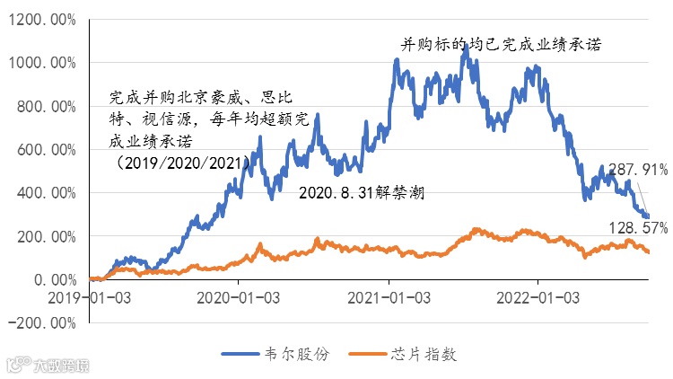 同期,芯片板块2019年开启快速上涨行情。韦尔股份在“业绩”与“行情”共振的背景下,实现了最高10倍的股价增长,显著跑赢芯片指数。