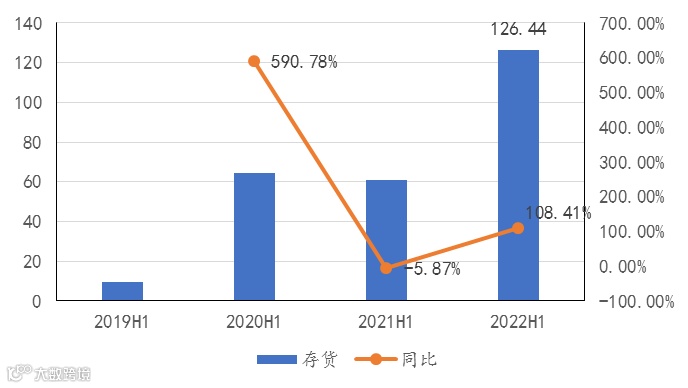 其次,韦尔股份可能存在误判芯片周期的可能,存货大幅增长,存货减值风险大幅提升。截至2022年H1,韦尔股份的存货账面价值已达126.44亿元,占资产总额的33.65%。