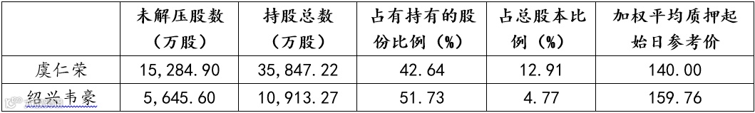 韦尔股份完成对北京豪威的收购,是其“麻雀变凤凰”的起点。但因“蛇吞象”式收购及高杠杆模式,导致了大量并购基金投资机构持有韦尔股份的股票,这些股票集中在2020年8月31日到期解禁,解禁盘占韦尔股份总股本的70.24%;导致韦尔股份实际控制人虞仁荣大量质押股票(具体如下)。