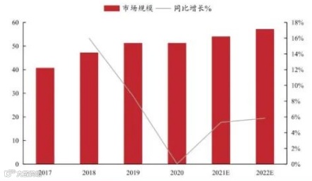 2017-2022年全球IGBT市场规模CAGR达7.04%,中国市场主要应用包括新能源汽车、工控、消费电子。受益于工业控制及电源行业市场的逐步回暖,以及下游的变频家电、新能源汽车等领域的迅速发展,全球及中国IGBT市场规模持续增长。根据WSTS数据,预计2022年全球IGBT市场规模将达到近57亿美元,2017-2022年CAGR达到7.04%。