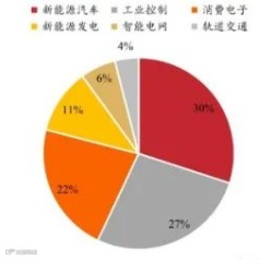 从下游应用领域规模及占比来看,2020年中国IGBT市场应用以新能源汽车、工业控制及消费电子类为主,占比分别为30%、27%及22%。
