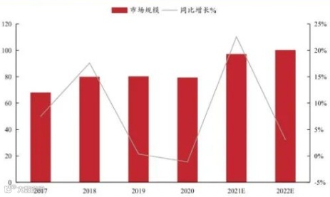 MOSFET是功率器件中规模最大的产品,2022年市场规模预计可突破100亿美元。根据WSTS数据,2021年全球MOSFET市场规模将达到97亿美元,占功率器件市场的54.2%,预计到2022年全球MOSFET市场规模将首次突破100亿美元,2017-2022年CAGR达到4.95%。