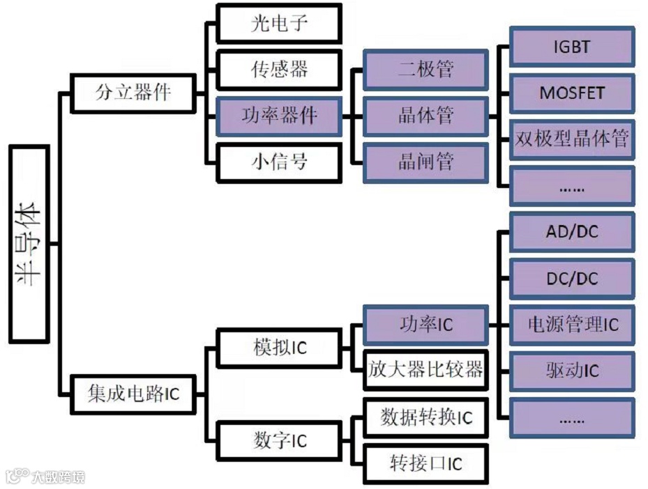 功率半导体按照器件集成度可以分为功率分立器和功率IC两大类。具体如下所示: