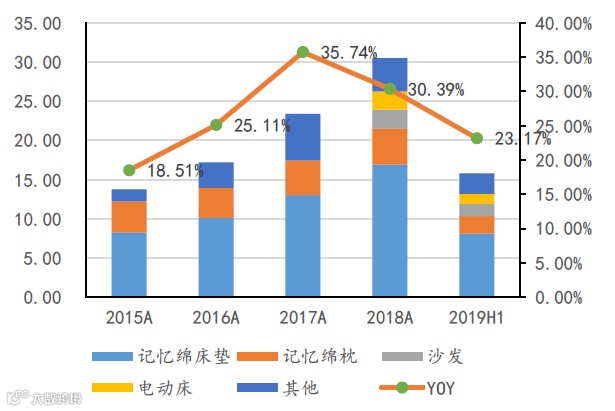 从营收结构来看,公司专注于“记忆绵床垫+记忆绵枕”,2018年起,公司为丰富产品线,新增了沙发、电动床产品。沙发和电动床有望为公司带来新的增长极。