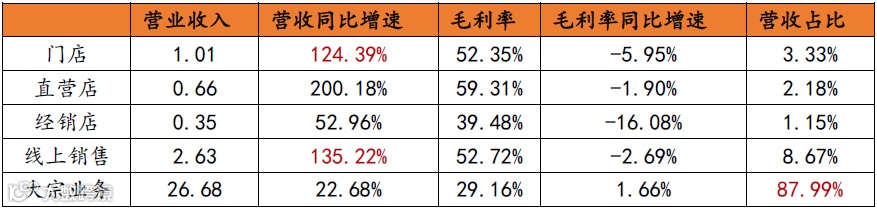 根据上表可知,公司的收入主要来源于大宗业务,营收占比达87.99%,但是,大宗业务的毛利率仅为29.16%。门店和线上销售的毛利率分别可达52.35%和52.72%,虽然,这两类渠道的营收占比不高,但是增速均达100%以上。