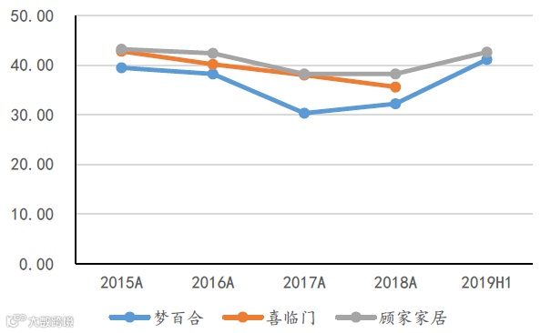 图表:公司、喜临门及顾家家居床垫的毛利率对比(%)