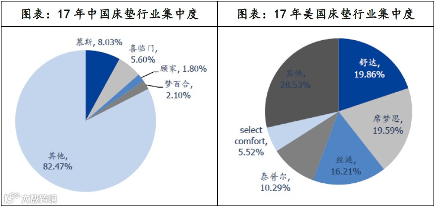 第三,我国床垫行业集中度低,CR4仅为15%,美国CR4为71%。而相对于其他家具产品(如定制家具、沙发等),床垫产品更容易标准化以及规模化,这使得床垫行业最具备品牌化的基础,龙头企业的规模优势和品牌效应将逐步显现。