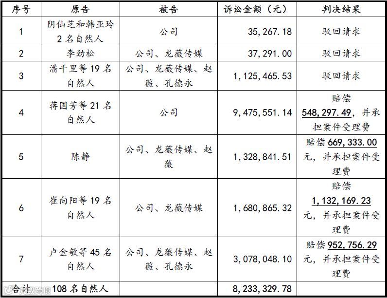 根据公司公告,截至2019年8月9日,公司陆续收到108份《民事判决书》,法院对108名原告起诉公司等有关方证券虚假陈述责任纠纷案审理终结并作出一审判决。具体情况如下: