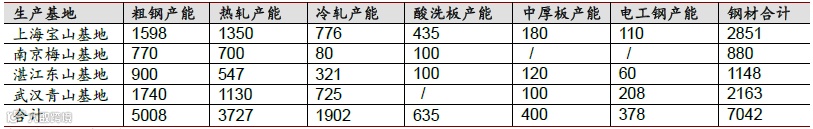 图表:宝钢股份四大基地主要产品及产能情况(单位:万吨/年)