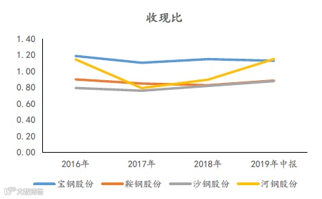 在四大钢厂中,宝钢股份的收现比处于较高位,结合宝钢股份的营运指标,宝钢股份下游的客户应收账款账期虽相对较长,但是回款质量表现不错。