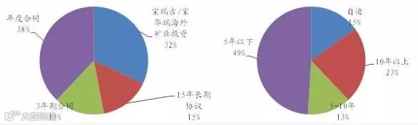 (1)铁矿石:通过合资,年度合同,3年期、15年期长协合同保障铁矿石的供应,其中,合资主要指与澳大利亚哈默斯利、巴西CVRD成立矿山合资企业;通过宝钢国际与世界主要铁矿石供应商签订长期采购合同。