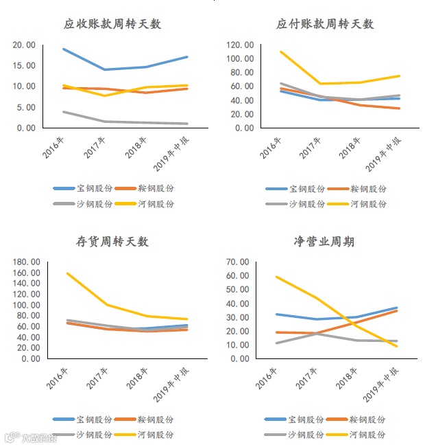 在四大钢厂中,宝钢股份的营运指标处于中等走高趋势。宝钢股份下游的主要客户为造船厂、汽车厂、家电厂等,客户集中度相对更高,议价能力更强(表现为应收账款账期更长)。