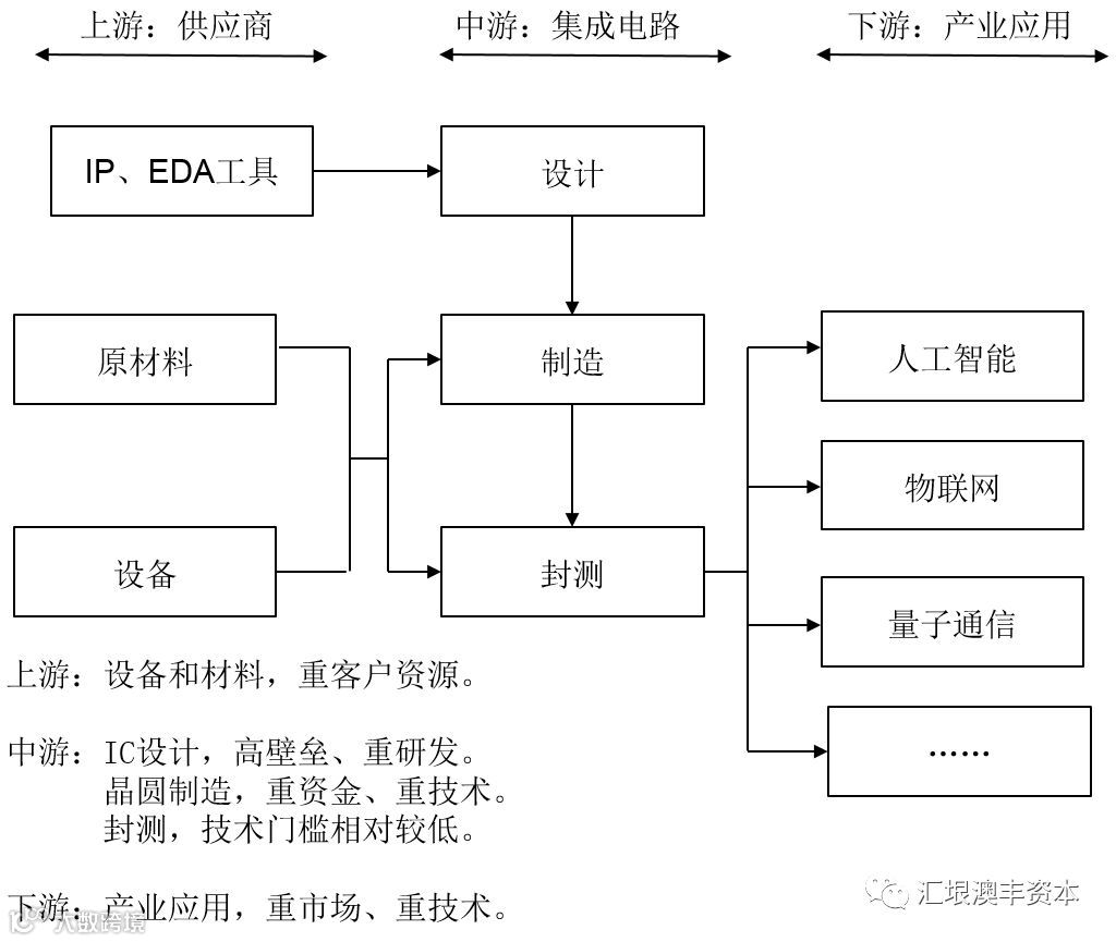 集成电路产业链上游主要为碳化硅、锗等原材料、制造设备,中游包括设计、制造、封测三个生产环节,下游广泛应用于人工智能、物联网、量子通信等领域,具体如下: