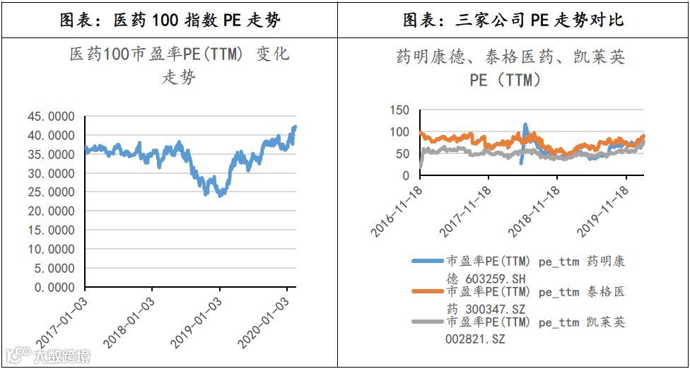 进一步对比同期,医药100指数(医药行业代表指数)和“药明康德+泰格医药+凯莱英”的PE(TTM)走势,具体情况如下: