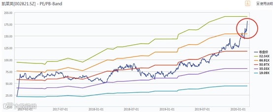 根据Wind的PE-Band测算,目前凯莱英的价位,处于上市以来PE(TTM)历史最高位,具体如下图所示: