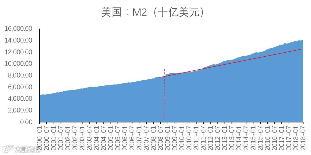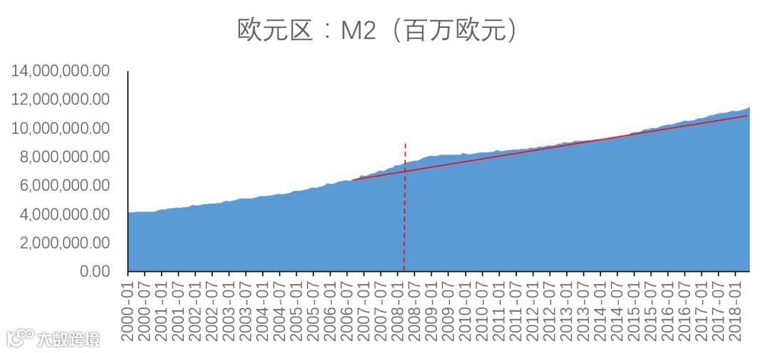 以下是2000年1月至2018年7月,中国、美国、欧元区的M2发行情况: