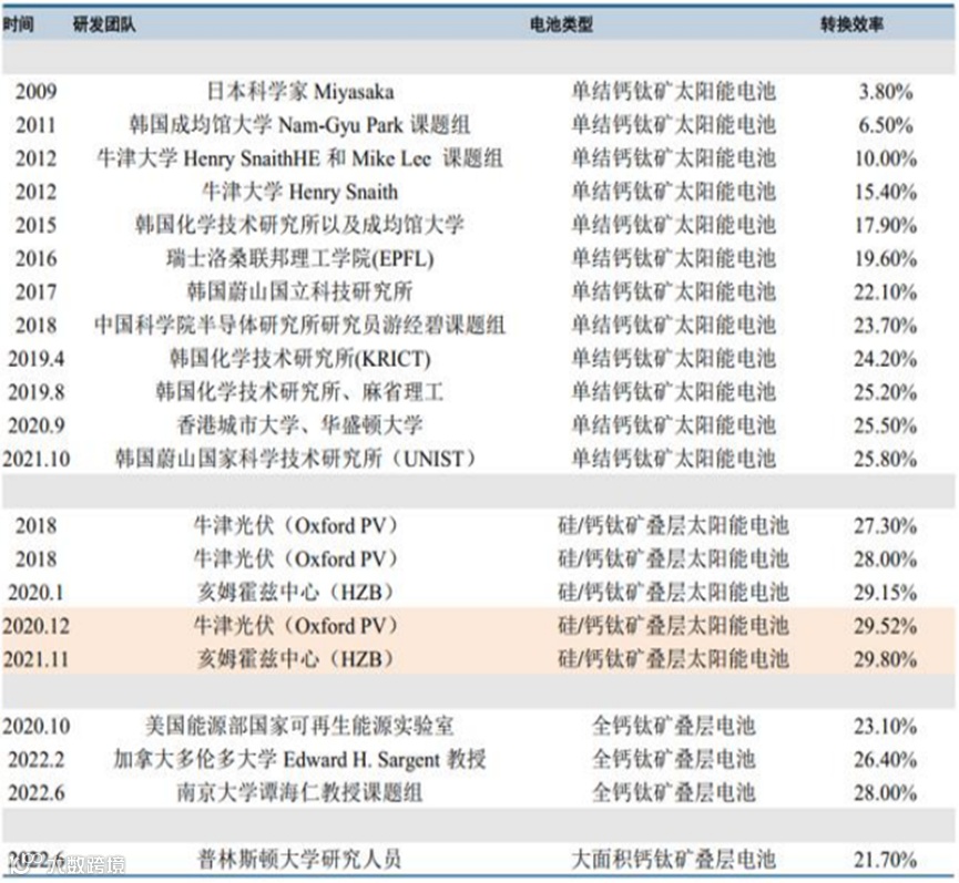 钙钛矿电池技术, 2009年,日本科学家Miyasaka最早应用在染料敏化太阳电池,当时转换效率仅3.8%。后经多国科学家研发迭代,单结钙钛矿太阳能电池实验室转换效率已达25.80%(2021.10);硅/钙钛矿叠层太阳能电池实验室转换效率达29.80%(2021.11)。