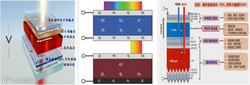 图表:单结、四端、两端钙钛矿电池结构图(从左至右)