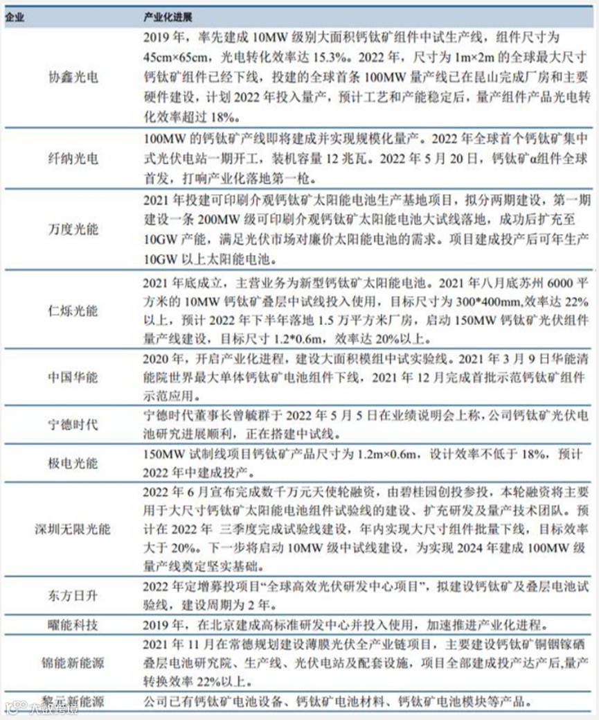 在资本加持的背景下,钙钛矿电池产业化进程加速,梳理国内钙钛矿主要企业的产业化进展情况,具体如下: