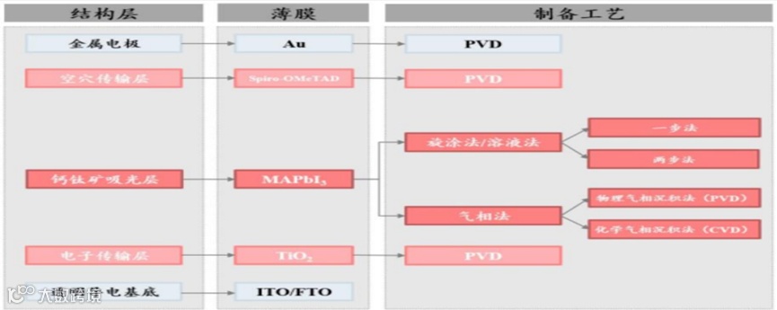 对应钙钛矿的五层结构,电子传输层(ETL)、钙钛矿吸光层、空穴传输层(HTL)为制备工艺的核心环节,最核心环节即钙钛矿吸光层的制备。透明导电基底层可外采导电玻璃或柔性片;金属电极通常通过使用贵金属真空蒸镀获得。