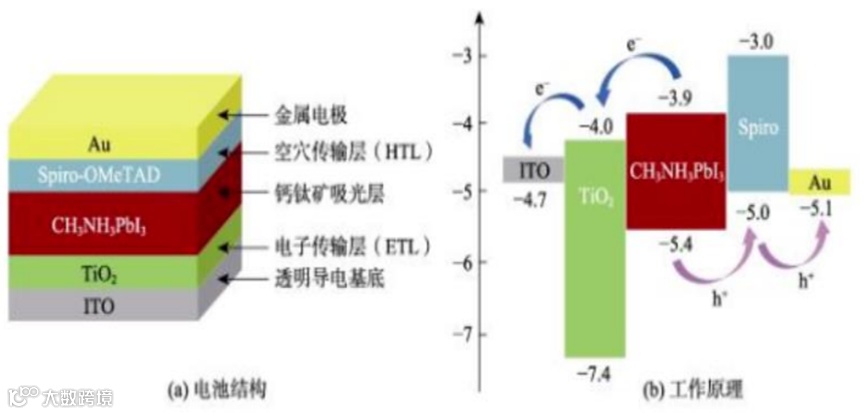 3)钙钛矿吸光层:典型代表为碘化铅甲胺(MAPbI3, MA=CH3NH3+),用于吸收太阳光产生光电子的活性材料。
