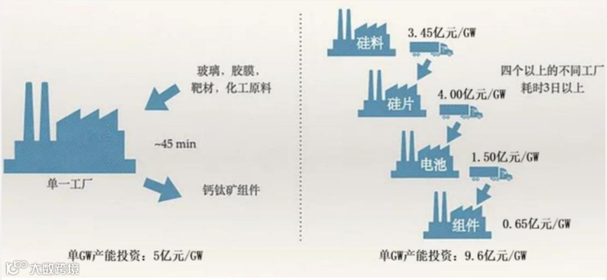此外,钙钛矿电池技术下,从原材料到钙钛矿组件仅需单一工厂即可完成,流程简单、生产周期短;而现在主流的单晶硅技术路线,是以产业链形式“硅料-硅片-电池-组件”完成组件交付,流程复杂、生产周期长。