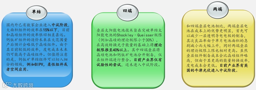 图表:单结、四端、两端钙钛矿电池的主要对比