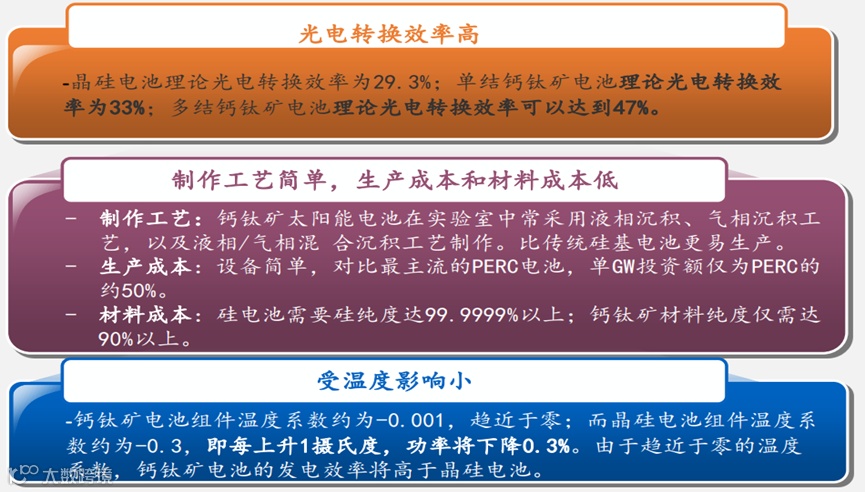 钙钛矿太阳能电池的优势:1)光电转换效率高;2)制作工艺简单,生产成本和材料成本低;3)受温度影响小。