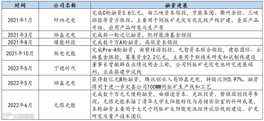 钙钛矿电池应用前景值得期待,2021年以来钙钛矿电池研发团队获得资本青睐,吸引了包括腾讯、宁德、碧桂园、长城等跨行业巨头纷纷入局。
