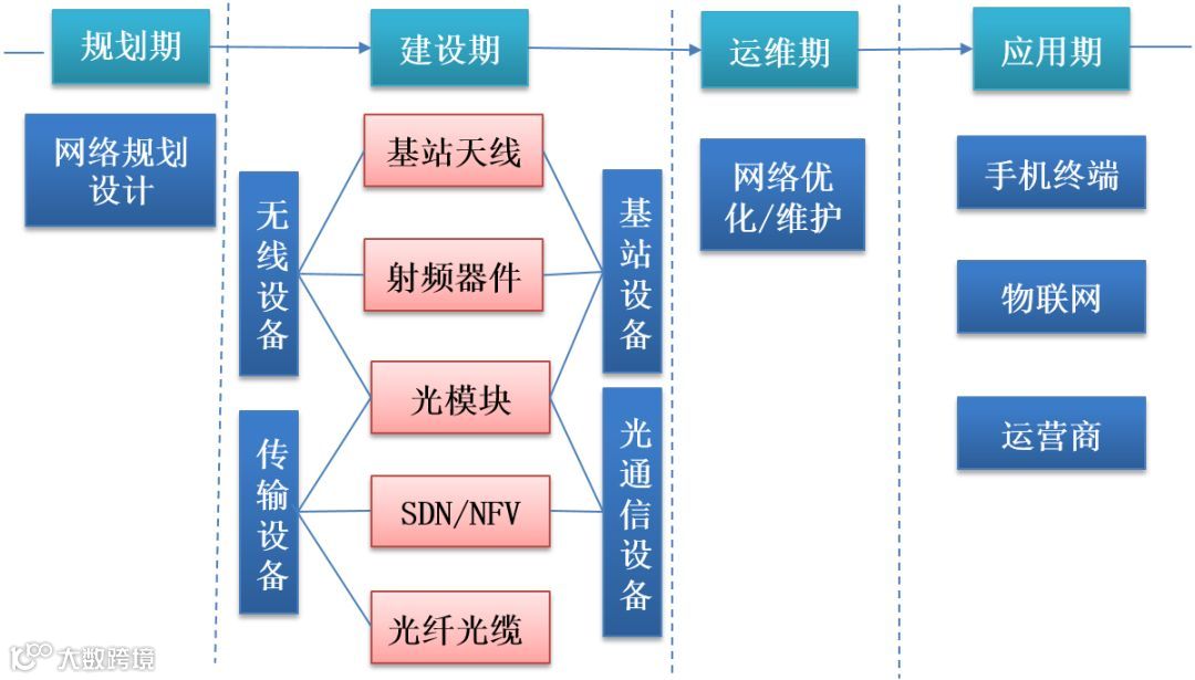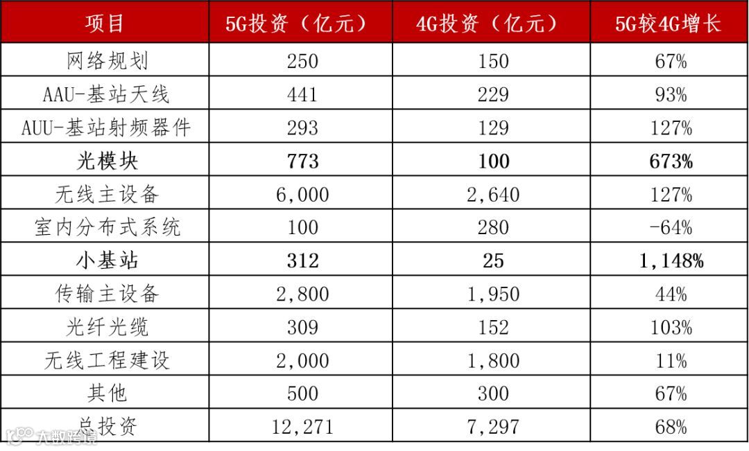 5G产业链相关业务均将受益,其中无线主设备、传输主设备投资规模最大;光模块、小基站的投资增速最大。