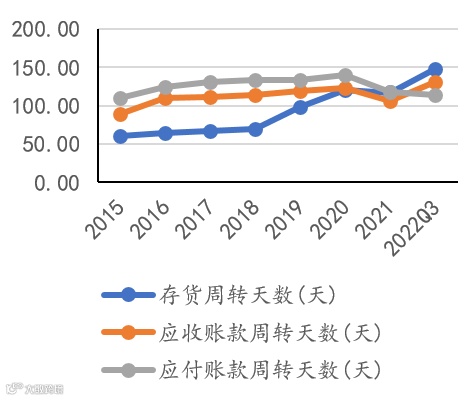 2018年后,海康威视的净营业周期大幅攀升,从2018年的49.76天升至2022Q3的164.79天,这主要系受“贸易战”影响,海康威视进行了大规模的备货,导致存货金额大幅攀升。