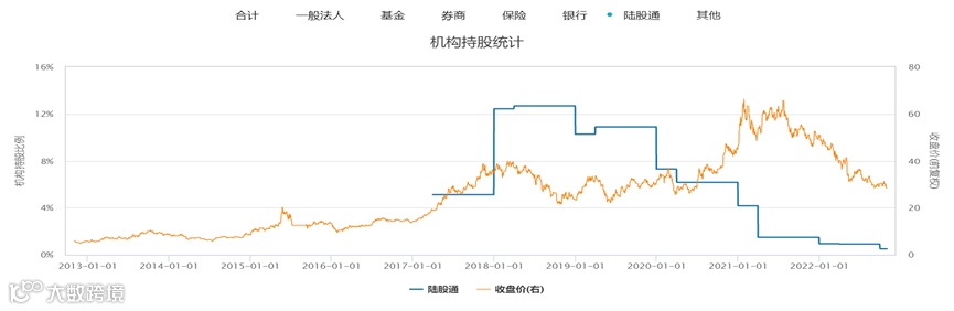 受“贸易战”扰动,北向资金(陆股通)自2019年开始大幅减持海康威视。此外,2020-2021年,海康威视经历国内基金抱团后,2022年基金开始大幅减持,仅高毅资产逆势加仓。