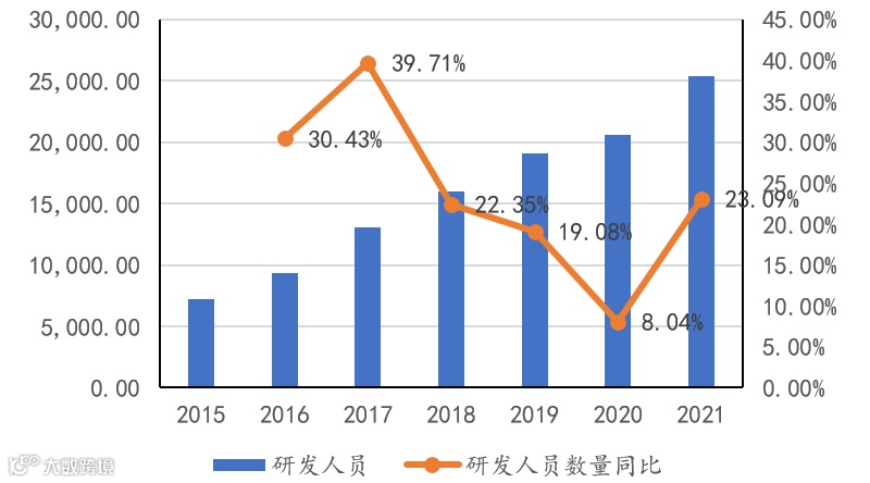 进一步,从研发人员数量来看,海康威视研发人员数量增速与营收、利润增速趋势基本一致,且研发人员的薪酬水平和公司人均薪酬基本一致,即公司属于“销售+研发”并重发展。