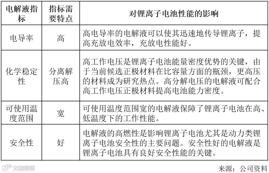 图表3:锂离子电池电解液主要性能指标
