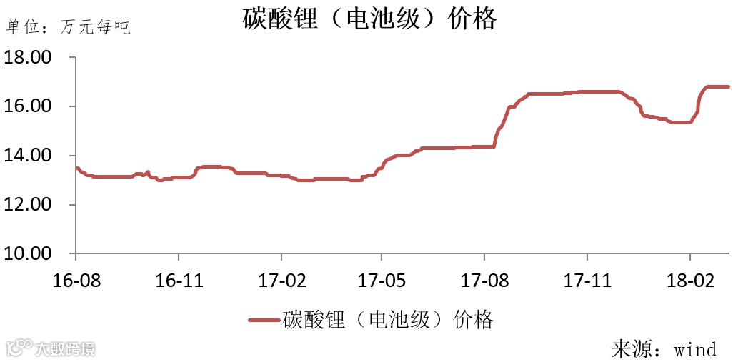 碳酸锂(电池级)每吨价格在2018年2月略有回落,之后仍维持在较高价位。氢氟酸价格持续走高,而六氟磷酸锂价格有所下调,未来由于原材料价格上升带来的压力将对六氟磷酸锂生产商带来一定程度影响。