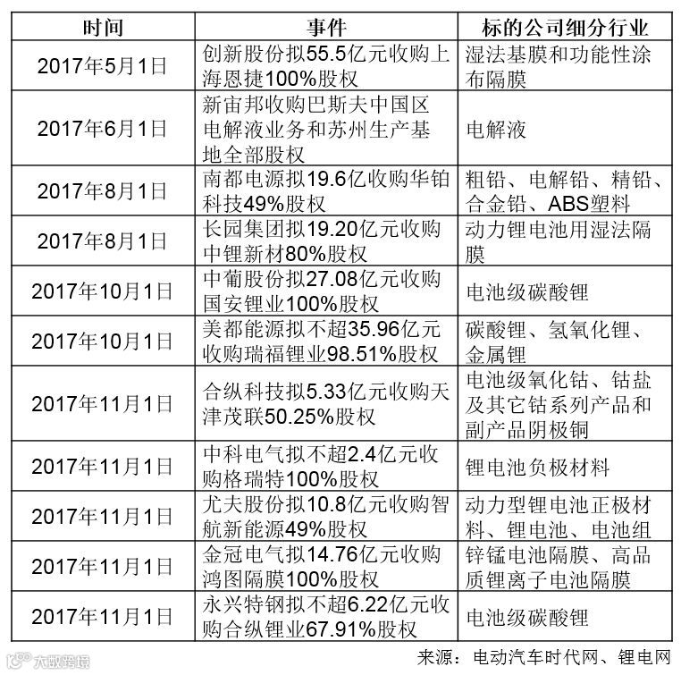 2017年,动力锂电池行业发展迅速,交易范围包括锂、镍、钴等矿产资源,正极材料、负极材料、隔膜和电解液等四大材料及电池制造等。