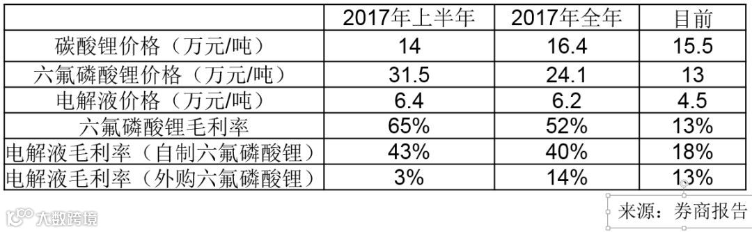②产能及价格情况:产能在快速扩张后迎来过剩,价格从2016年10月份以来开始下滑。从产能上来看,2017年新增产能在3万吨以上,产能的集中释放导致材料价格的下滑,若下游新能源汽车放量不达预期,行业将在快速的产能扩张后迎来产能过剩的局面。六氟磷酸锂是电解液中最重要的原材料,它的价格波动将直接影响下游电解液厂商的原材料成本,进一步影响其利润空间。