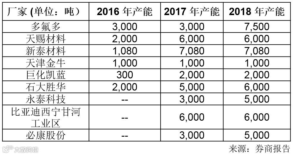 图表5:六氟磷酸锂主要厂家产能释放情况