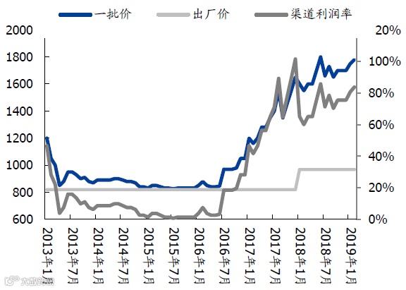 图表:53度飞天茅台一批价、出厂价及渠道利润率