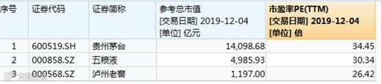 截至2019年12月5日,贵州茅台、五粮液、泸州老窖的市值、市盈率表现如下: