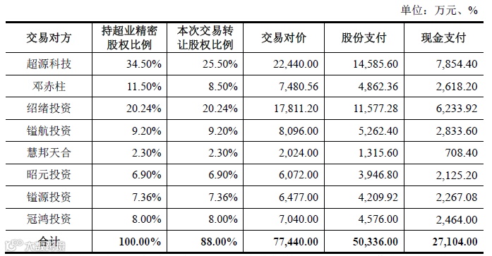 超业精密100%股权预估值为8.80亿元,其88%股权交易金额暂定为7.744亿元。初步的支付安排如下: